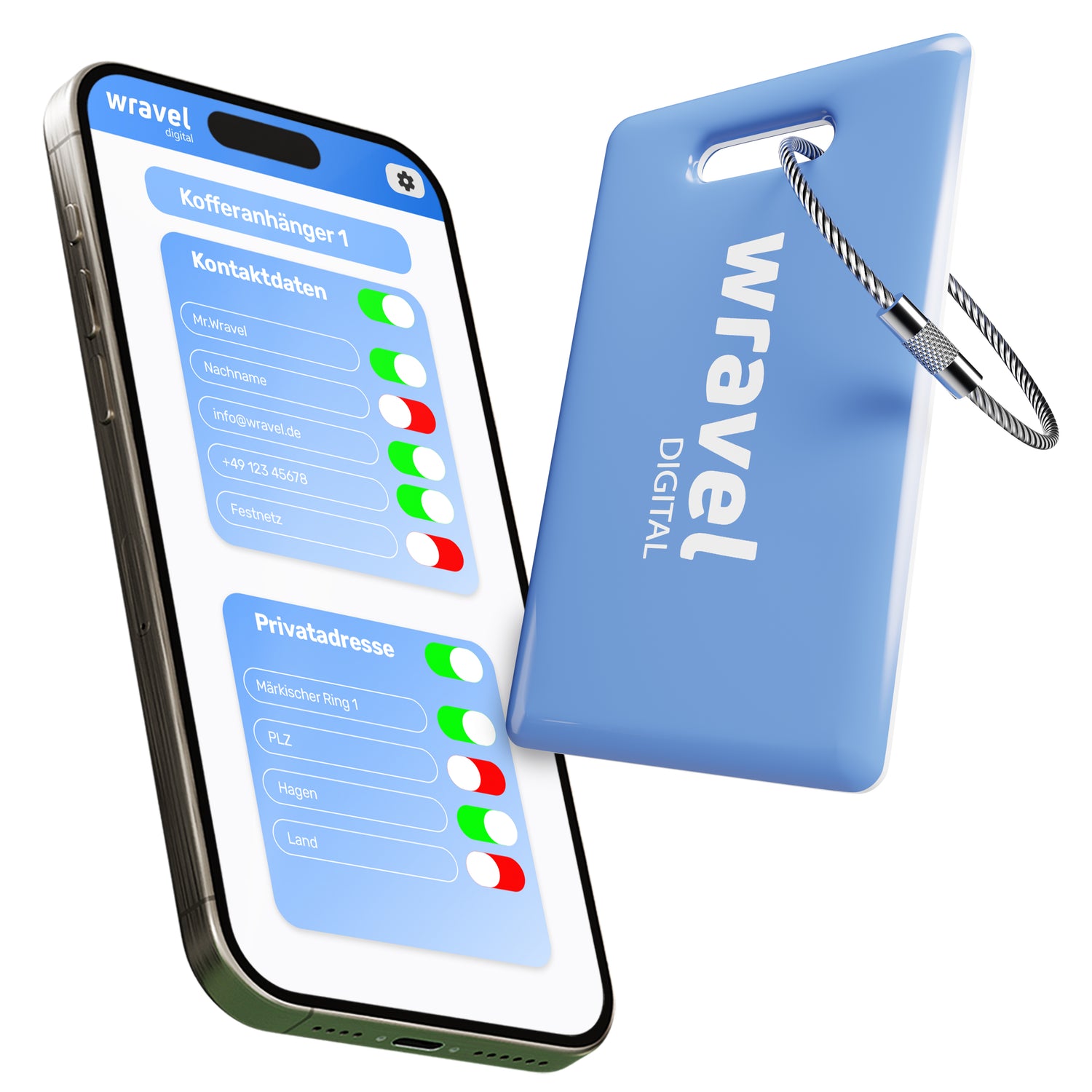 Ein digitaler Kofferanhänger wie der Wravel Tag ersetzt den klassischen Papieranhänger. Statt handschriftlicher Angaben enthält er einen individuellen QR-Code (und NFC-Chip). Wird dein Gepäck gefunden, kann der Finder den Code einfach scannen und dich über deine hinterlegten Kontaktdaten direkt kontaktieren – sogar über WhatsApp. Du entscheidest selbst, welche Daten sichtbar sind, und kannst sie jederzeit online anpassen.