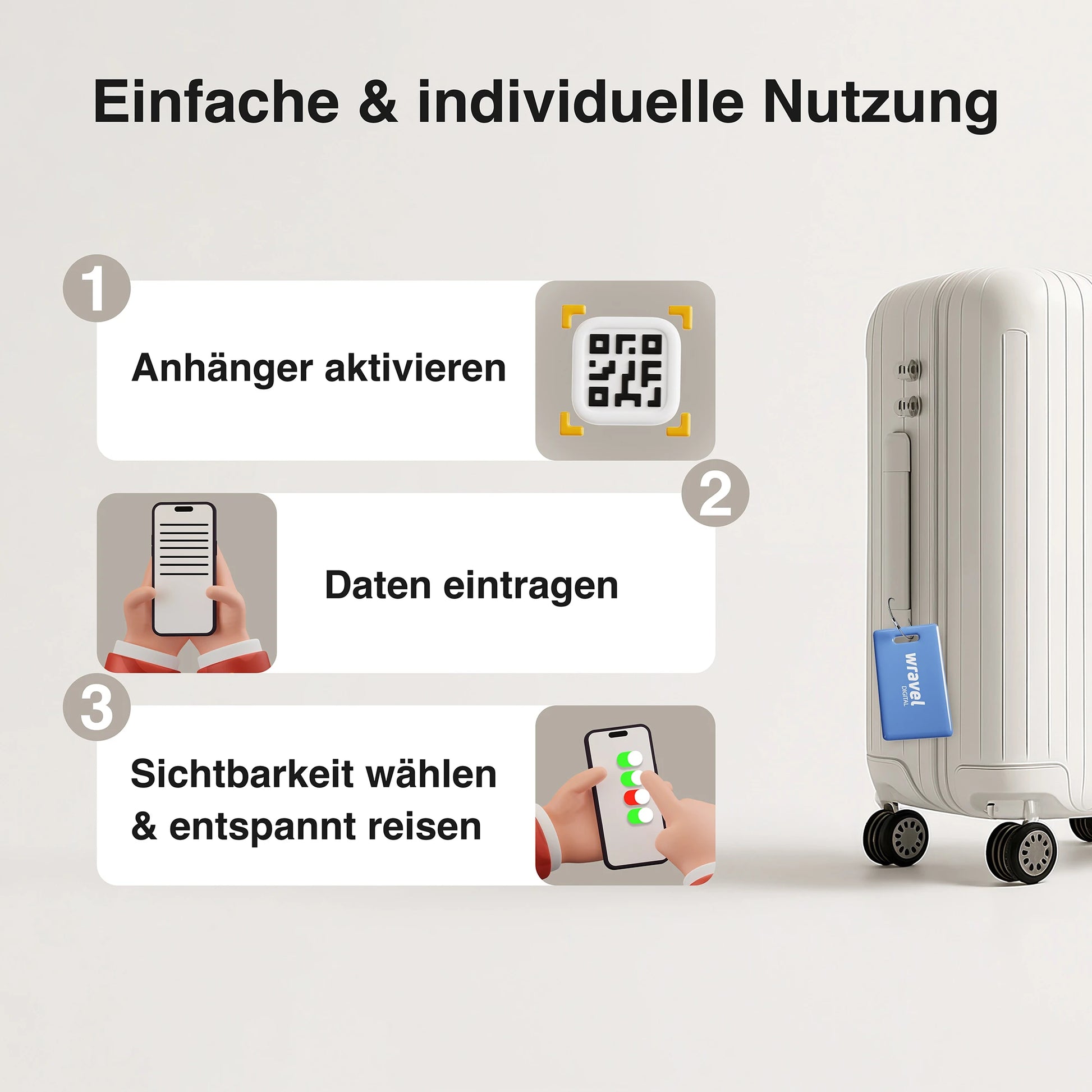 Wravel Digital bietet Dir smarte Badges mit QR-Code, die Du an Deinem Koffer oder anderen Gegenständen anbringen kannst. Sollte Dein Gepäck verloren gehen, kann der Finder den QR-Code scannen und Dich kontaktieren – aber nur, wenn Du den "Verloren"-Modus aktiviert hast.