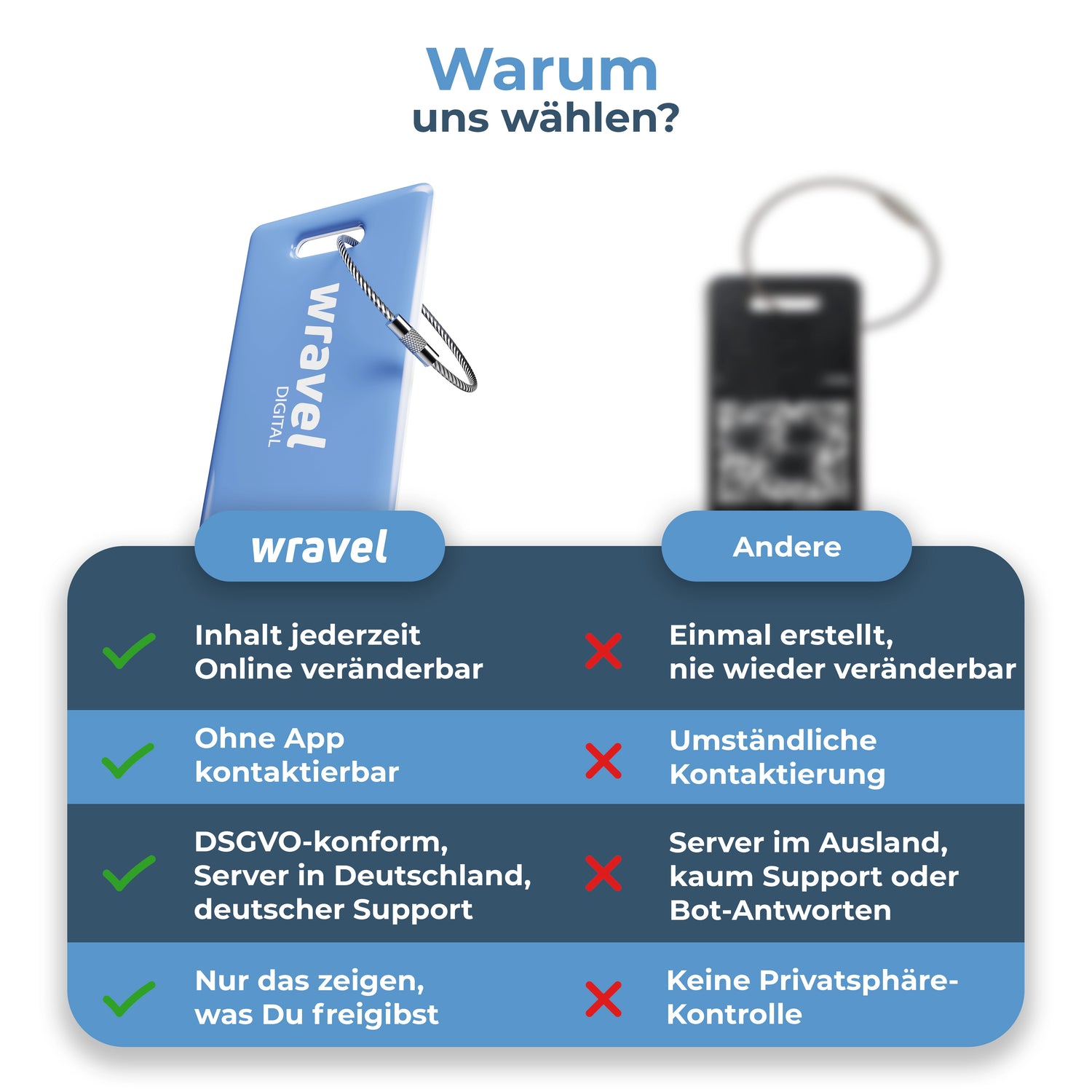 Während andere Anbieter auf statische Gepäckanhänger setzen, bekommst Du bei Wravel einen intelligenten, der nicht nur gut aussieht, sondern auch wirklich schützt. Und wenn mal etwas nicht funktioniert, sind wir für Dich da – mit echtem Support und schneller Hilfe. Unsere eigene Plattform, gehostet in Deutschland, garantiert Dir volle Kontrolle über Deine Daten. Kein Weitergeben, kein Risiko – bei uns steht Datenschutz an erster Stelle. Wravel steht für smarte Reisebegleiter, die Du mit gutem Gewissen tragen kannst.